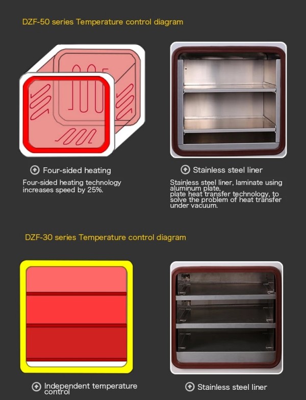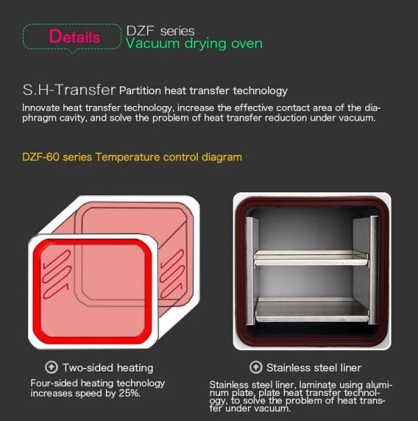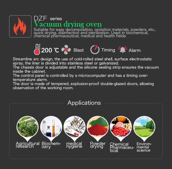 Vacuum Drying oven widely used in biochemical, chemical and pharmaceutical, health care, agricultural research, environmental protection and other research applications for powder Drying and roasting, as well as disinfection and sterilization of glass containers used. Particularly suitable for Drying heat-sensitive, easily decomposed, and the complex composition of easily oxidized material items for fast and efficient Drying.