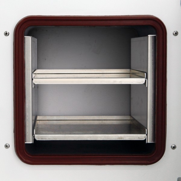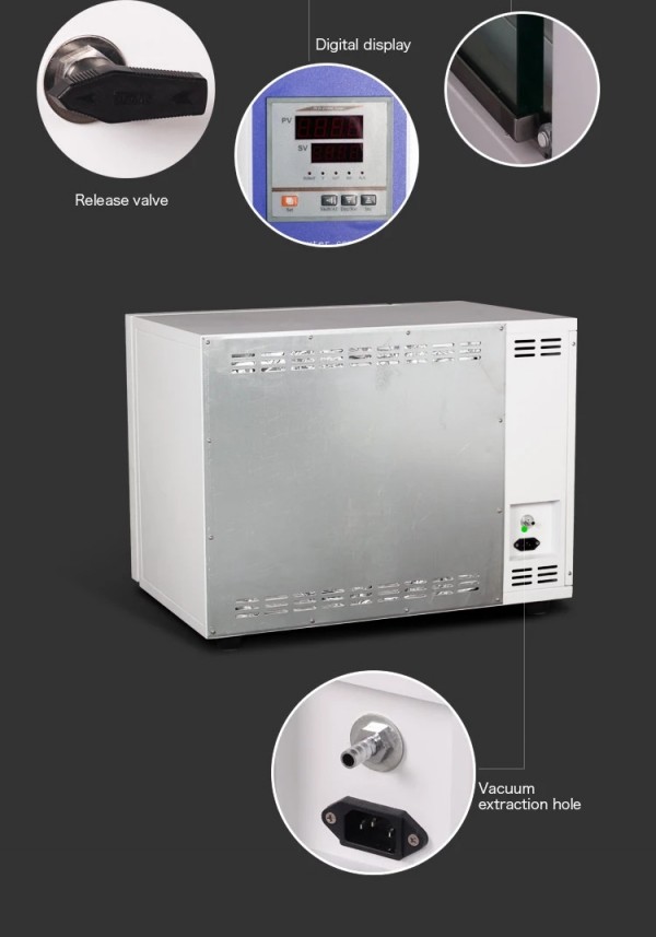 Overall shape of the silicone rubber door seal to ensure a high vacuum oven, control panel with microcomputer control, solenoid control vacuum valve switch.