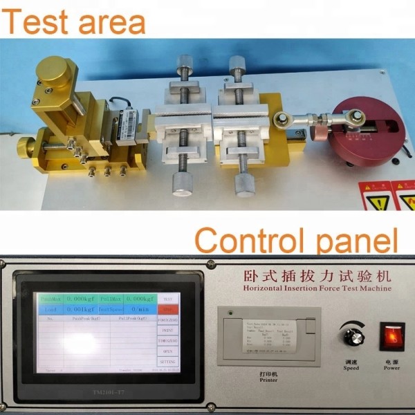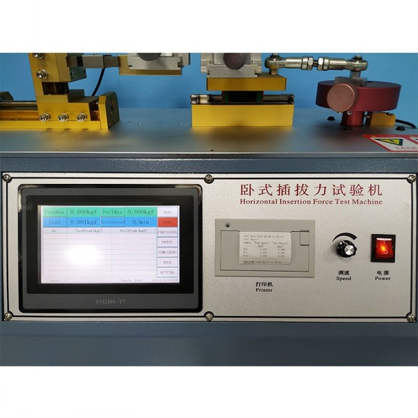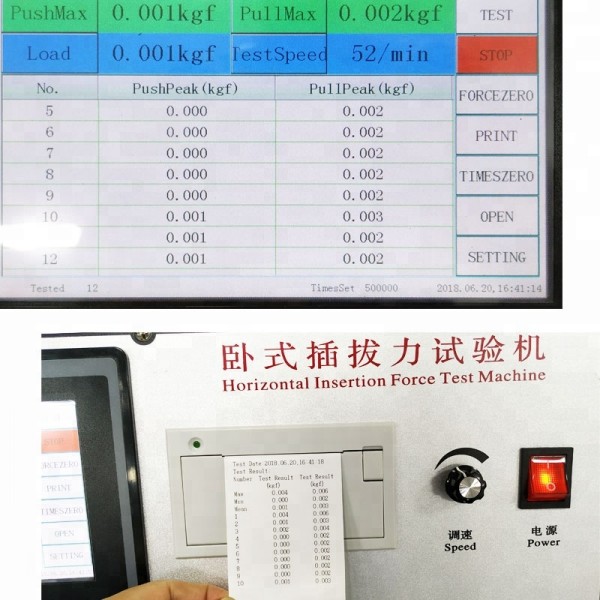 Digital connector insertion force test machine device is suitable for a variety of connector plug test purposes, embedded microcomputer control technology, which can display insertion force, extraction force, real force value, and have set times, travel speed is adjustable, and display speed value, auto-zero, arithmetic and other units turn. Rotating eccentric power design, test speed travel is no longer associated with the test, long, short stroke different connectors, test equally fast.