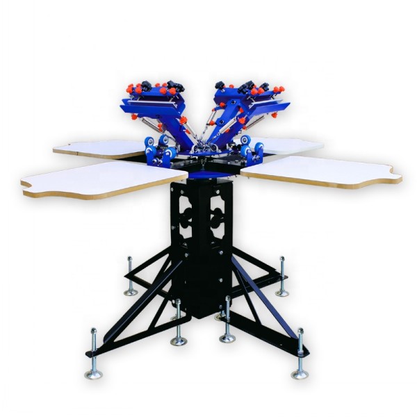 SPE442 4-color-4 station screen press can apply 4 screens to 4 stations simultaneously. The printing layer and the screen layer and the pallet layer can rotate independently, which makes it easy for multicolor printing, material loading and unloading, finally brings more wide rage, convenient and faster printing effect. The equipment can be applied to costume, woven fabric, metal, paper, and copy book, plastic, wood, glass, ceramic leather and other products need flat printing. It’s especially suitable for small enterprise and individual use. ASC442N 4 color 4 –station screen press is the only one and the only double-rotary printing machine which adopts assembled instruction but still can guarantee the accuracy color registers of 4 colors in 4 stations. It has kept the common functions of the similar machines, such as double rotary of pallet layer and screen layer, high pulling intensity of double sprinting, height of pallet putting up and down, screen adjusted in all round, left and right location of screen frame support arm, etc,. What’s more, it has some special functions with human nature, overcoming the shortcomings of the traditional machines, which brings more relaxed accurate but higher efficient printing effect. So it’s the highest cost performance screen printing machine during the screen presses with the same prices.