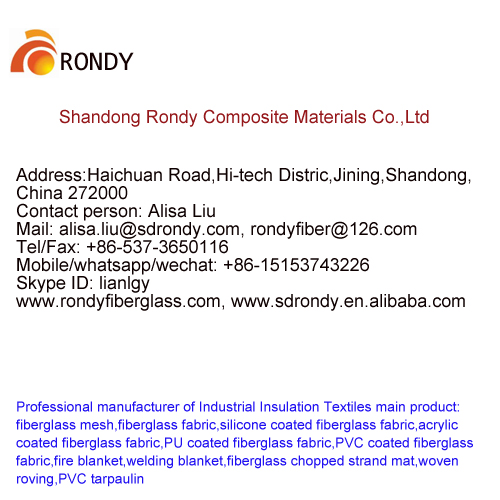 Shandong Rondy Corporation is the professional manufacturer of high temperature insulation fabrics in China since 2009 year. These speciality fabric provide temperature protection from 100℃ -1000℃.The main product including fiberglass cloth,texturized fiberglass cloth,silicone coated fiberglass cloth,PU coated fiberglass cloth,acrylic coated fiberglass cloth,vermiculite coated fiberglass cloth,aluminum foil laminated fiberglass cloth,silica cloth,PTFE coated fiberglass cloth,aramid fabric ,etc.