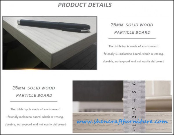 | Desktop board: | 25mm solid wood particle board (this board is made of environment friendly E1 melamine board,which is strong,durable,waterproof and not easily deformed |